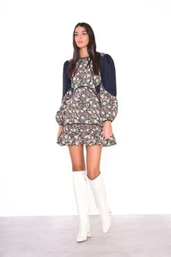 Glamorous Navy Folk Poplin Navy Pattern Puff Sleeve Mini Dress