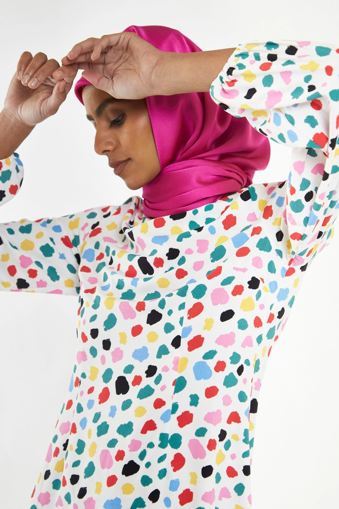 Featuring a unique abstract spot print design and a flattering midi-length cut, this dress is sure to turn heads wherever you go. The long sleeves provide modesty and comfort while the lightweight and flowy fabric ensures breathability and ease of movement.
