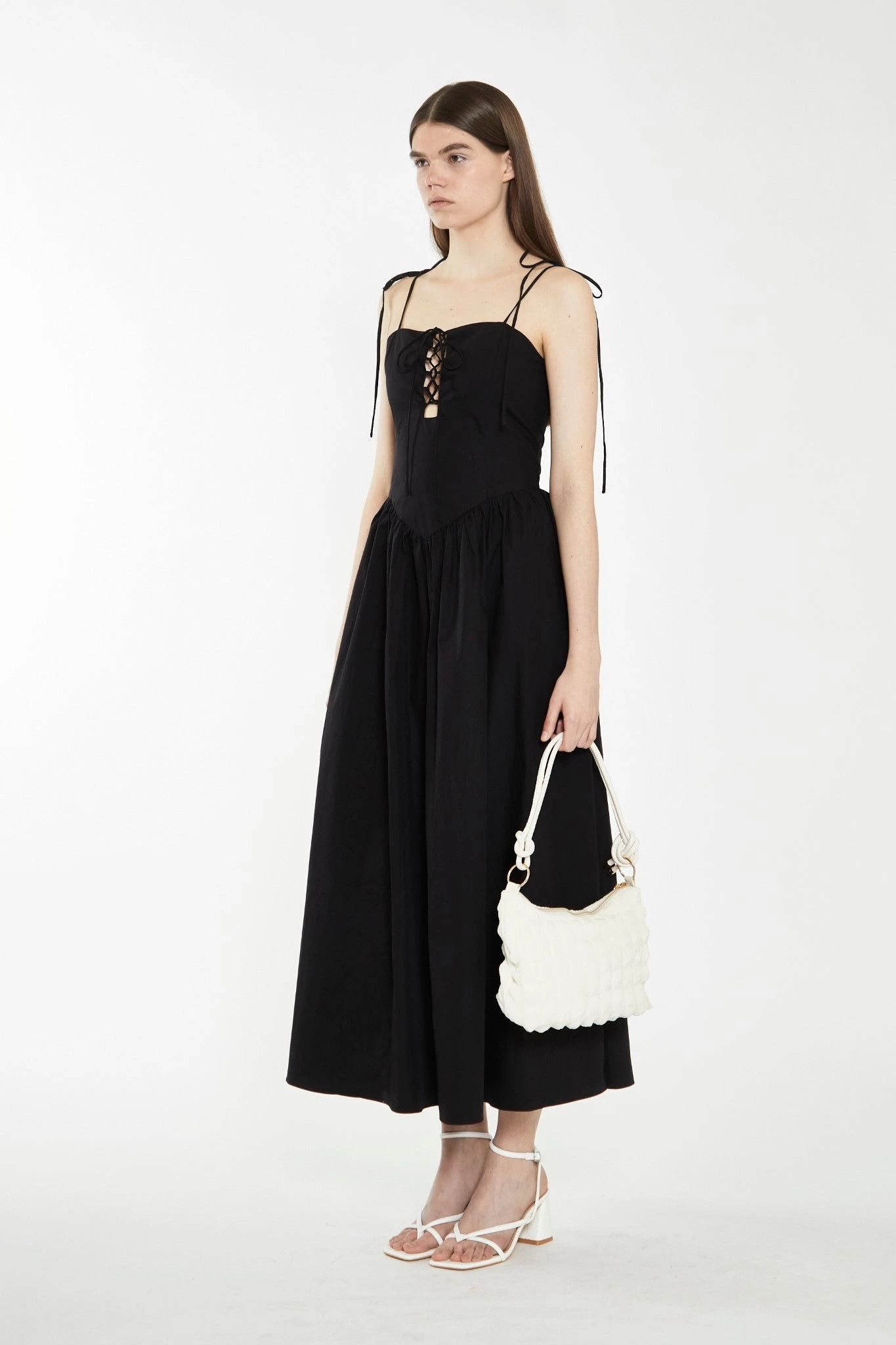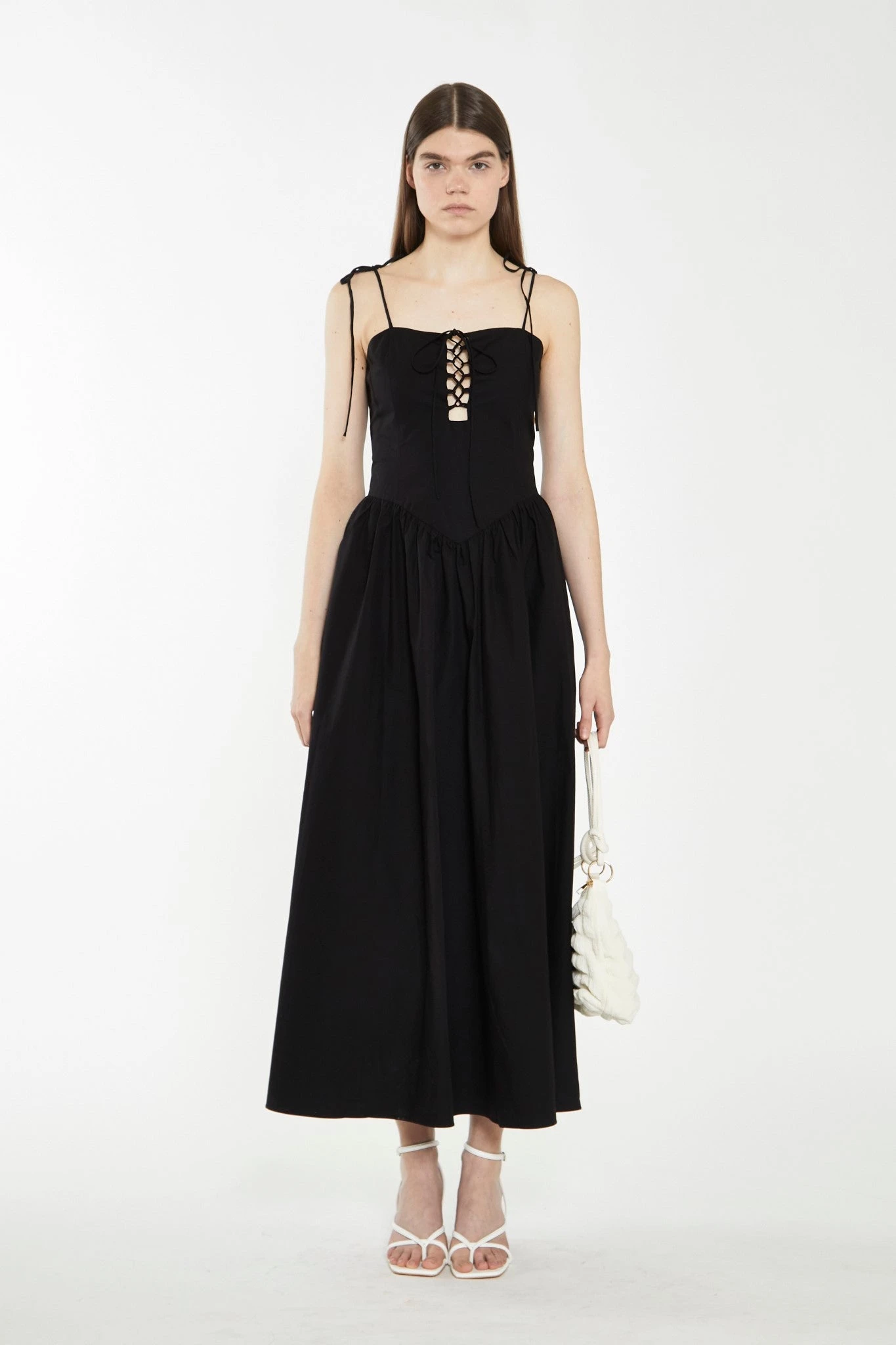 Featuring a stunning black colour and a lace-up bodice, this maxi dress is both elegant and alluring. The flowy silhouette and maxi length provide a flattering fit while the back zip closure adds a touch of sophistication and style.