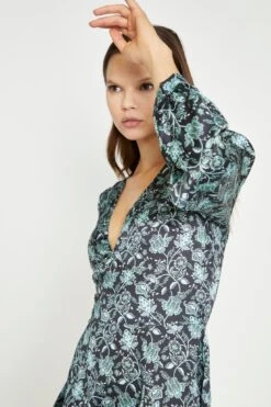 Glamorous Womens Black-Mint Paisley Satin Long Sleeve Tea Mini-Dress. This Black-Mint Paisley Satin Long Sleeve Tea Mini-Dress is the perfect way to look classy and on-trend. With its V-Neckline, long puff sleeves and Satin fabric, this mini dress is sure to turn heads. So, dont wait, add this dress to your wardrobe today!