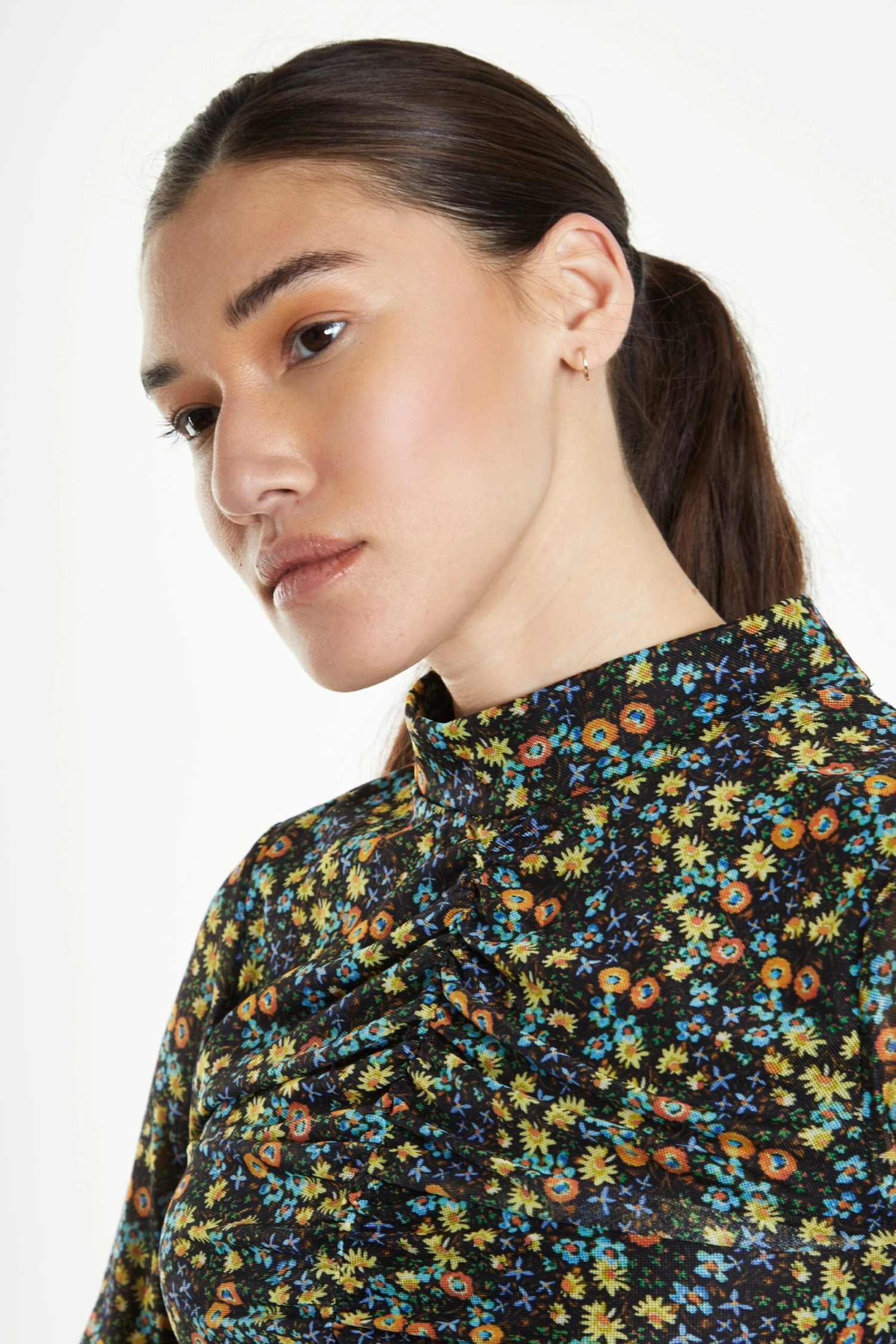 Glamorous Black Multi Floral Mesh Long Sleeved Ruched Mini Dress. Perfect for drinks with the girls or a date night. This super flattering piece features a bodycon mini fit with a ruched body, long sleeves and neckband. Looks fab paired with some cute strappy heels and a clutch for the ultimate stylish look!