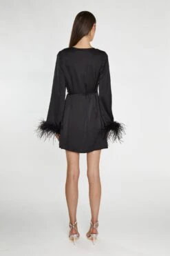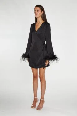 Glamorous Black-Satin Feather Trim Wrap Mini-Dress