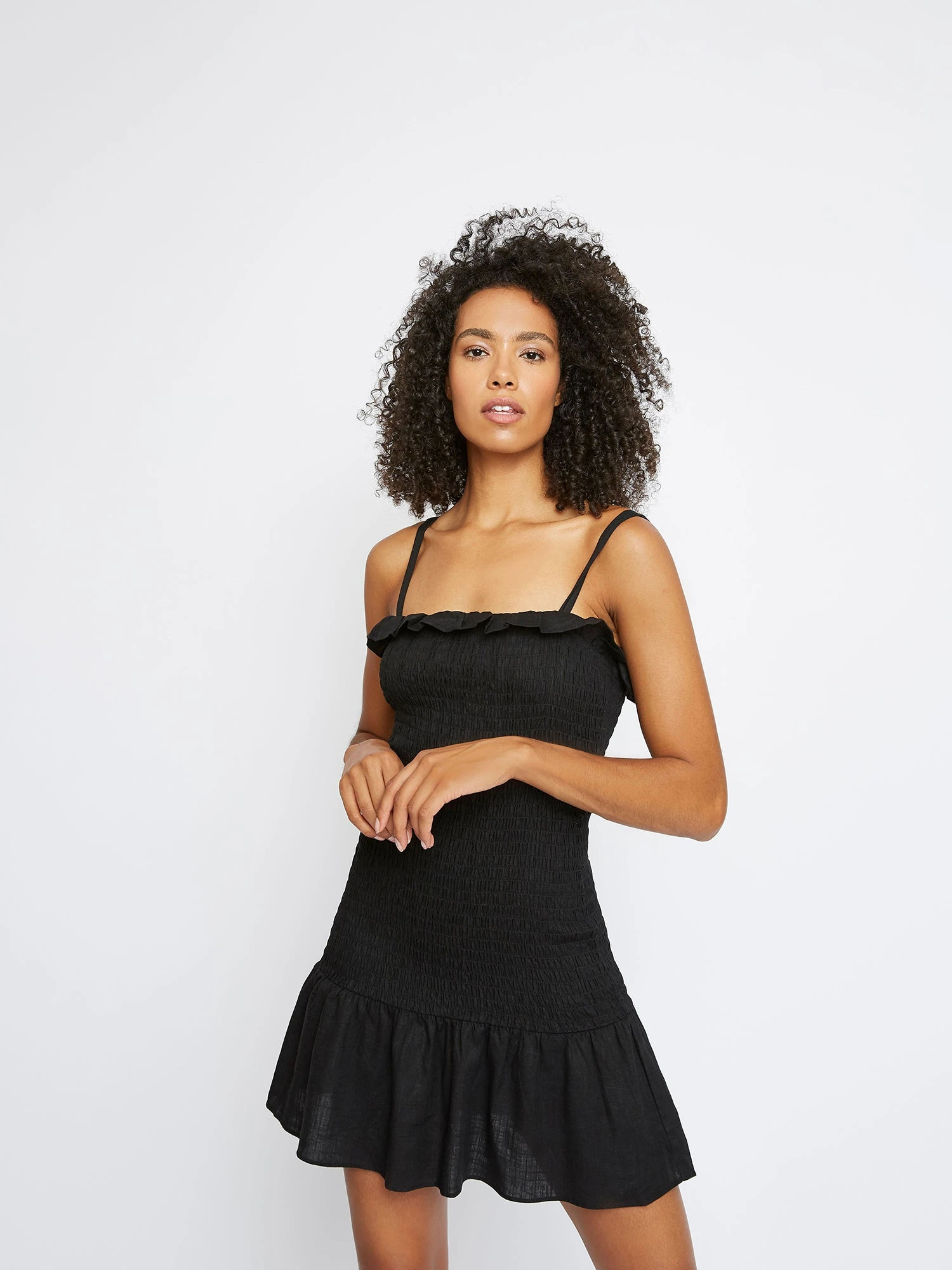 Glamorous Womens Black Shirred Frill Trim Mini Dress. Chic and sophisticated, this dress is a must have for every wardrobe this summer. Featuring figure flattering shirred texture, frill detail and flippy hem, looks great teamed with sliders for relaxed daytimes or dress up with strappy heels for hot summer evenings.