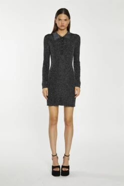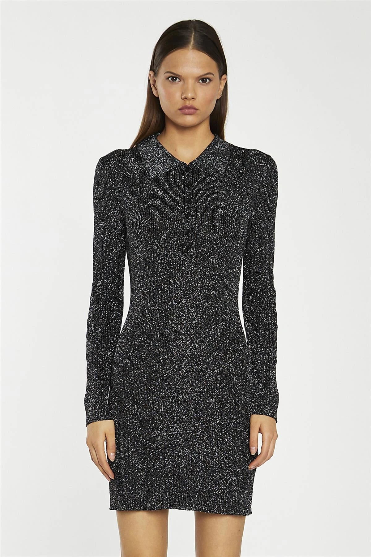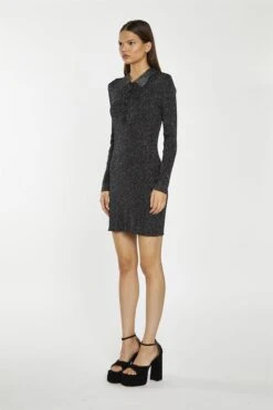 Glamorous Women’s Black-Silver Rib Button-Up Collar Mini-Dress. Make a statement with this rib knit, button-up collar mini-dress. Show off your curves in this bodycon fit and long sleeve design. The Perfect day dress, wear this with boots and tights to battle the colder weather whilst looking totally chic!