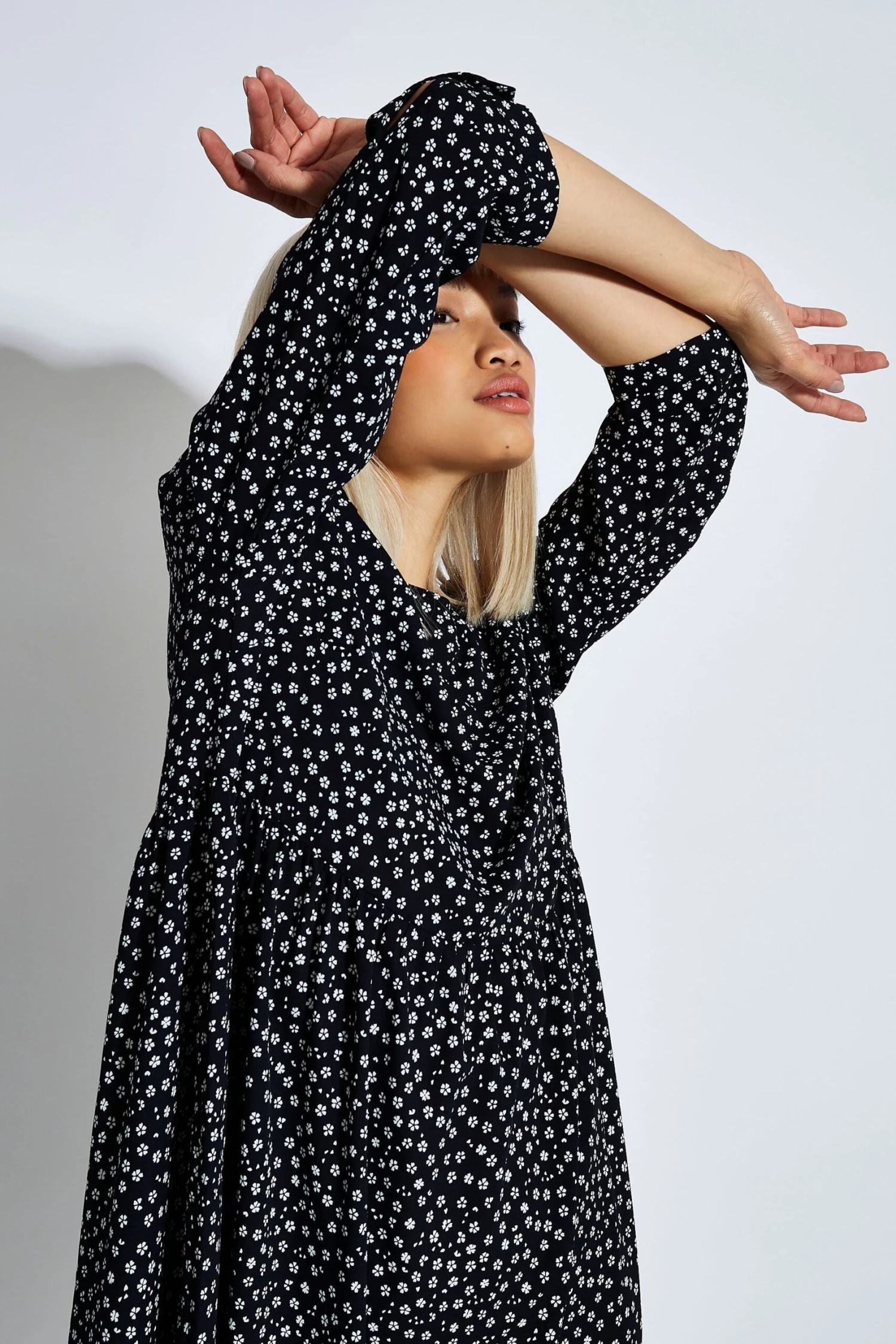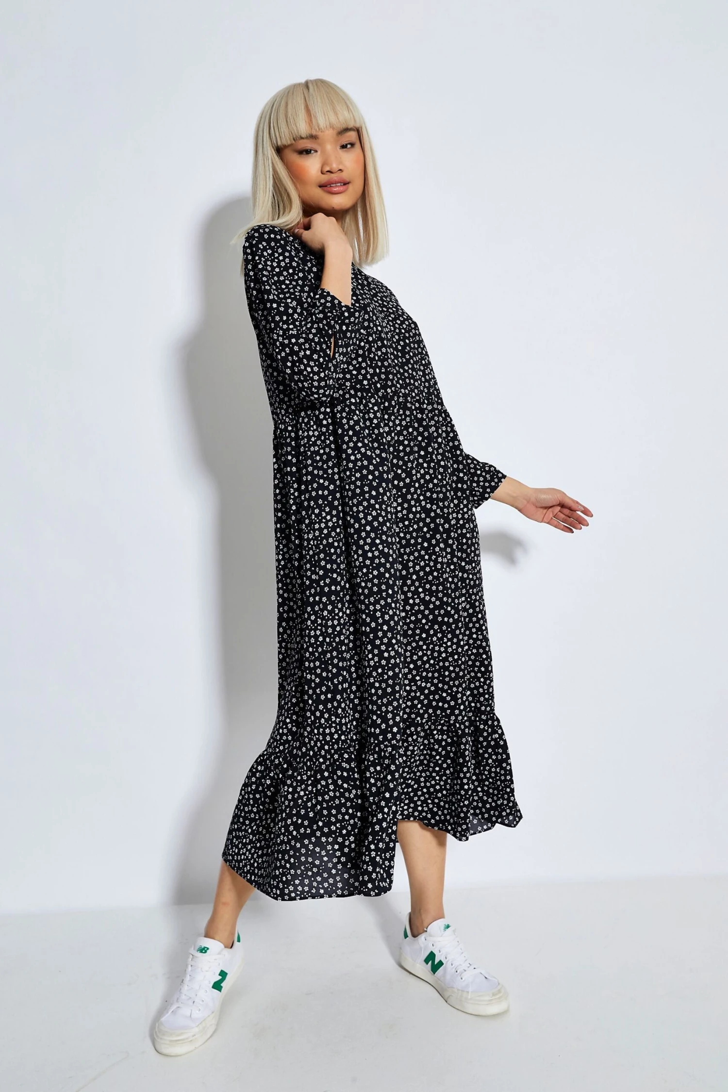 Glamorous Womens Black White Mini Ditsy 3/4 Length Sleeve Midi Dress. This super on trend midi dress is the must have staple piece this season. Featuring a shift midi style, 3/4 length sleeves and ditsy print, this dress is super flattering addition to your closet! Style with your favourite boots for the daytime and switch to heels for the evening.