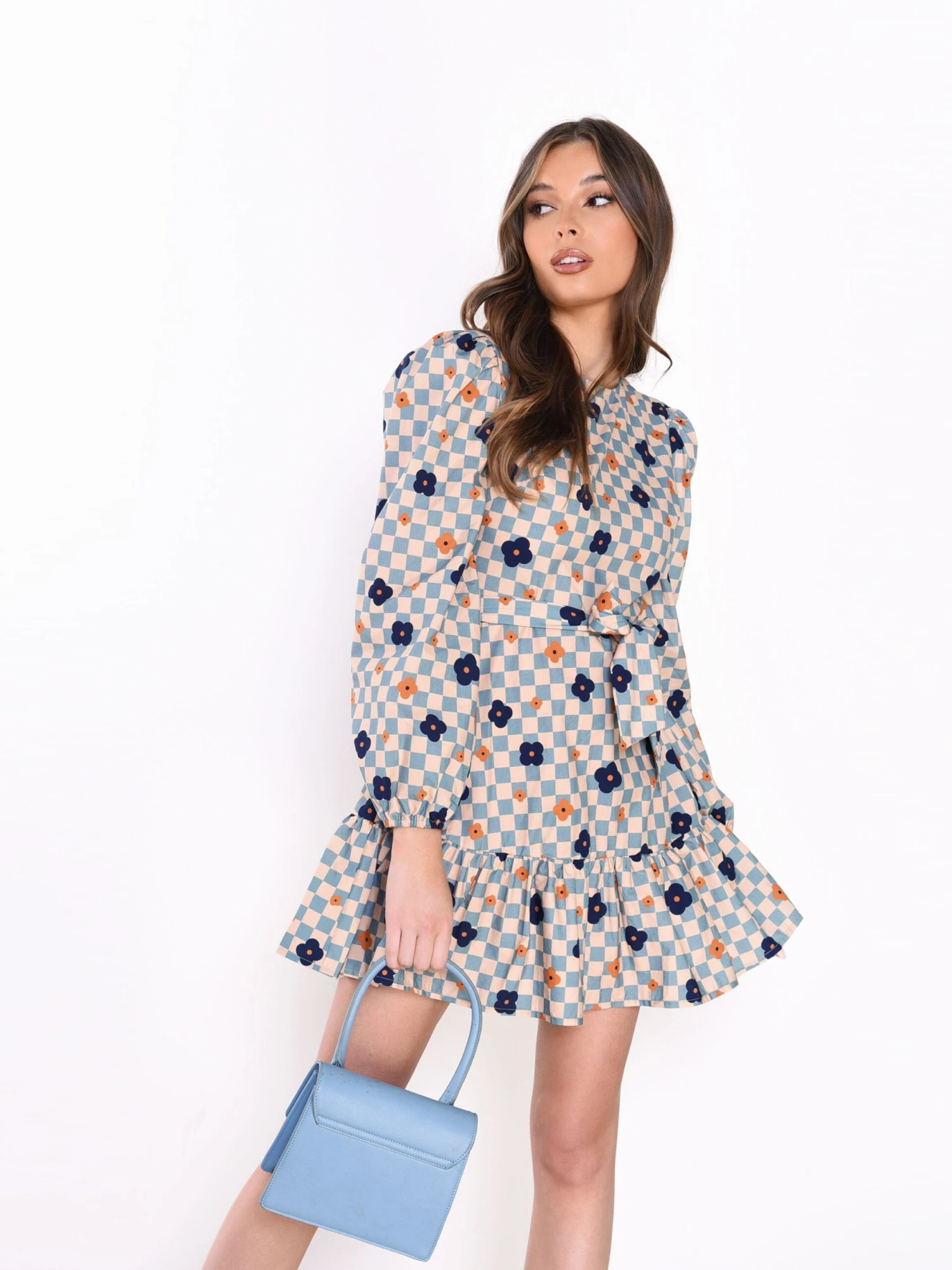 Glamorous Womens Blue Check Flower Tie Waist Mini Dress. We love this cute dress! A wardrobe must have this floral print is so on trend this season. Featuring tie waist detail, will be your go to for every occasion this Autumn. Looks great teamed with chunky boots or dressed up with your favourite heels for cocktails with the girls.