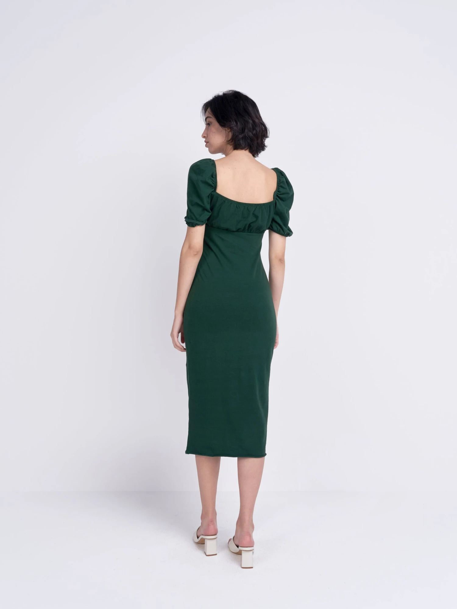Glamorous Care Forest Green Tie Front Midi Dress. This stunning piece is a must have for Spring/Summer with puff sleeves and flattering silhouette. This is the perfect addition to your Autumn wardrobe, whilst doing your bit for the planet, with this chic recycled polyester fabric dress. Add some trainers or heels for the ultimate look.
