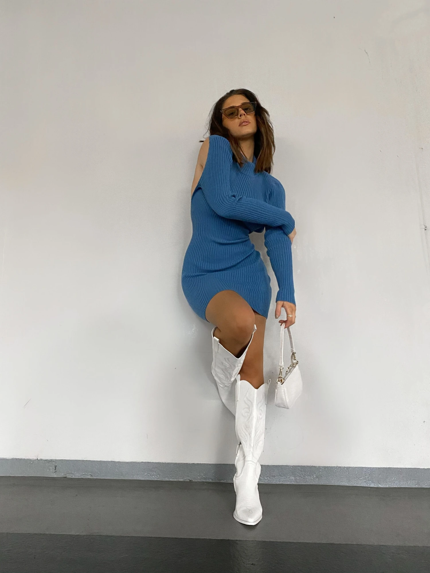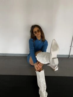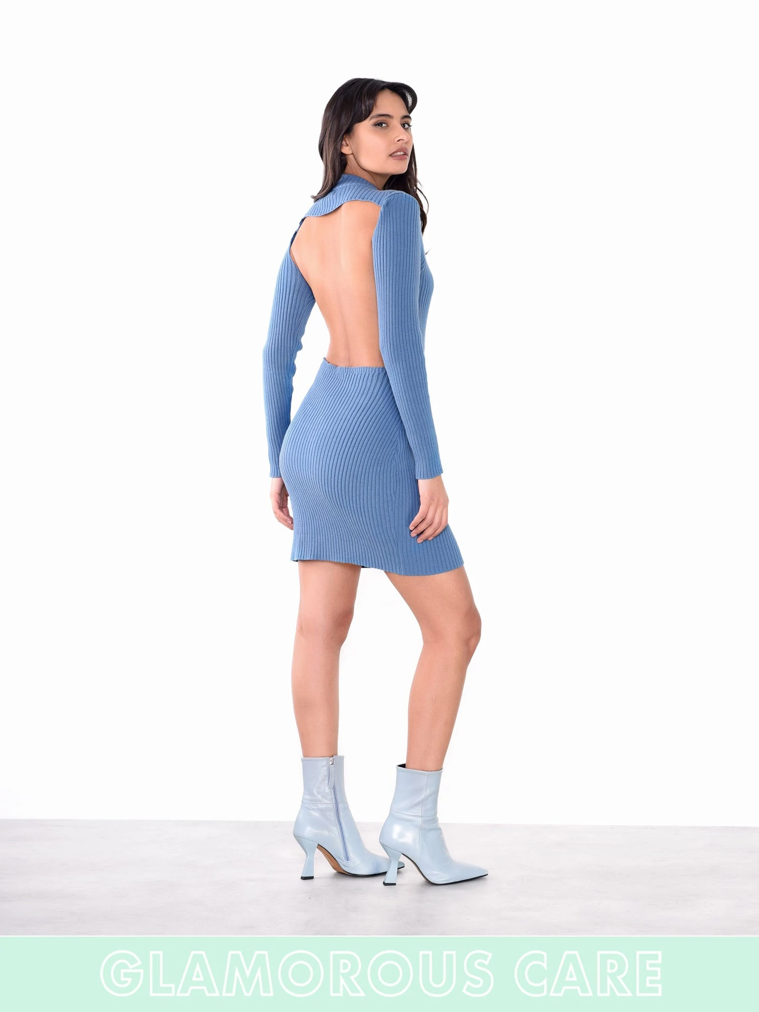 Glamorous Care Stone Blue High Neck Long Sleeve Backless Ribbed Mini Dress. We cant get enough of this ribbed mini dress featuring a high neck, long sleeves and a backless finish, this is a super on trend flattering fit. Join our positive journey towards reducing the impact that fashion has on our planet by styling this with some heels for the evening or trainers for the daytime for the perfect environmentally friendly look.