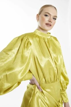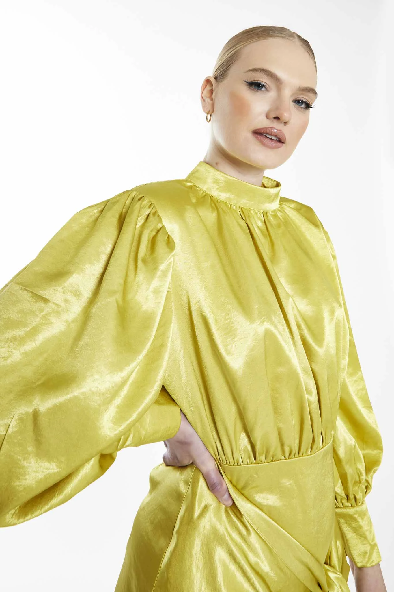 Glamorous Collection Lime High Neck Mini Dress with Tie Front Detail. This show stopping sustainable piece is a must have for your wardrobe this season. Featuring a high neck, long sleeves with shoulder pads, and a statement tie front detail, this mini dress is the glitz and glam you need for party season. Style with your favourite heels to complete the look!Â