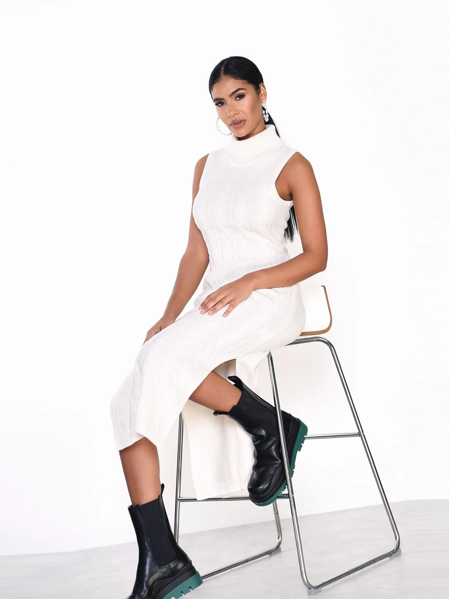 Glamorous Womens Cream side Split High Neck Knit Midi Dress. This super on trend midi dress is the must have staple piece this season. Featuring a midi style, side split detail and cable knit style this dress is super flattering addition to your closet! Style with your favourite high knee boots for the daytime and switch to heels for the evening.