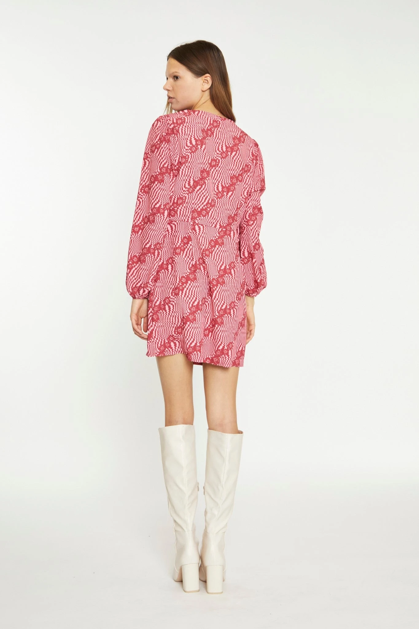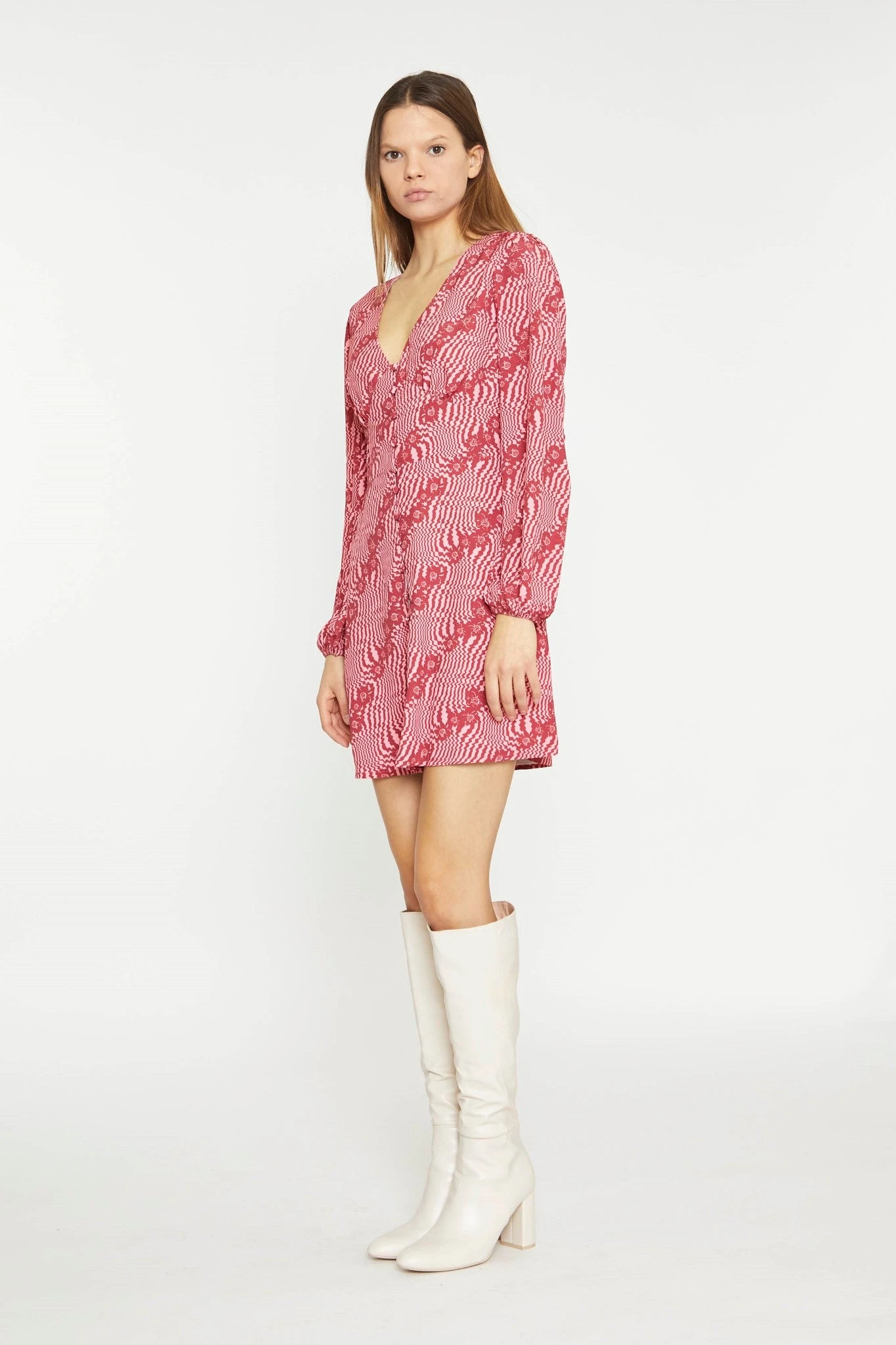 Glamorous Womens Digital-Wave Flower Long-Sleeve Mini-Dress. This cute floral mini dress is perfect for any occasion. Featuring a V-neckline and long sleeves with button front detail, this piece will look great on you! Pair with some knee-high boots for an on-trend look this Spring.