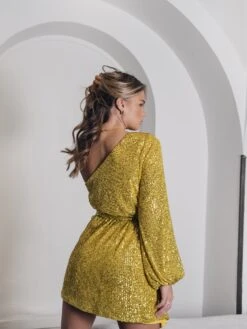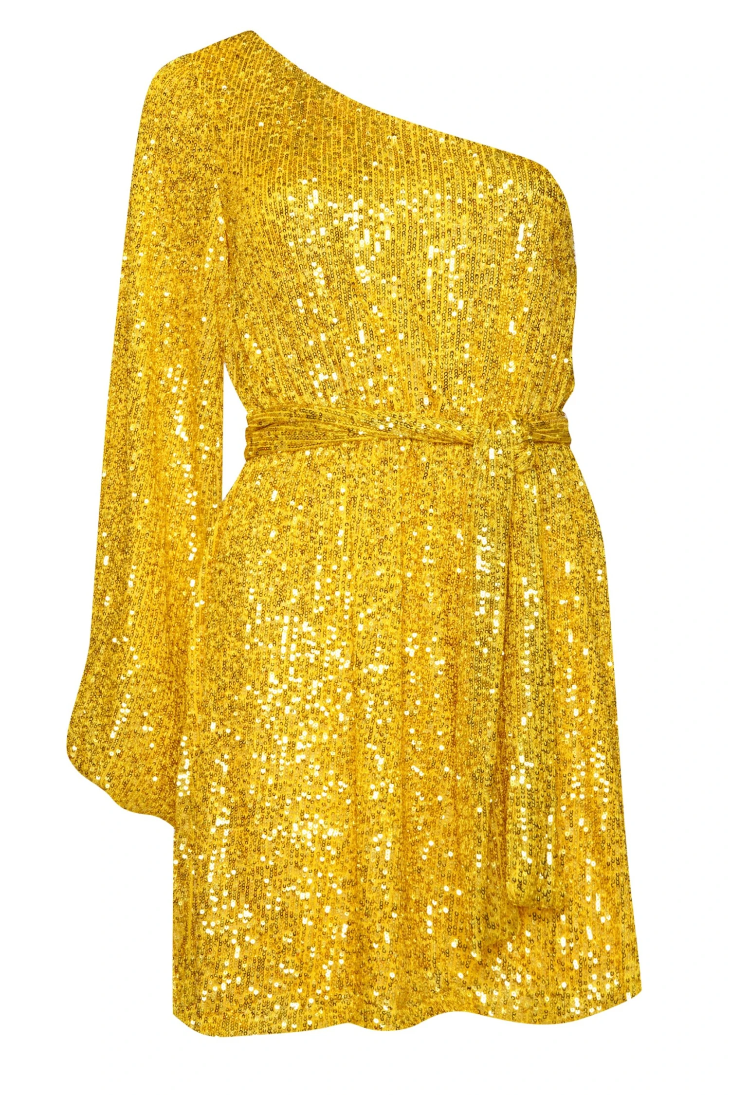 Glamorous Women’s Gold Sequin One Sleeve Mini Dress. Our all over sequin mini dress is designed with one sleeve and a tie waist detailing. Glitter the night away and shine any evening with this modern number!