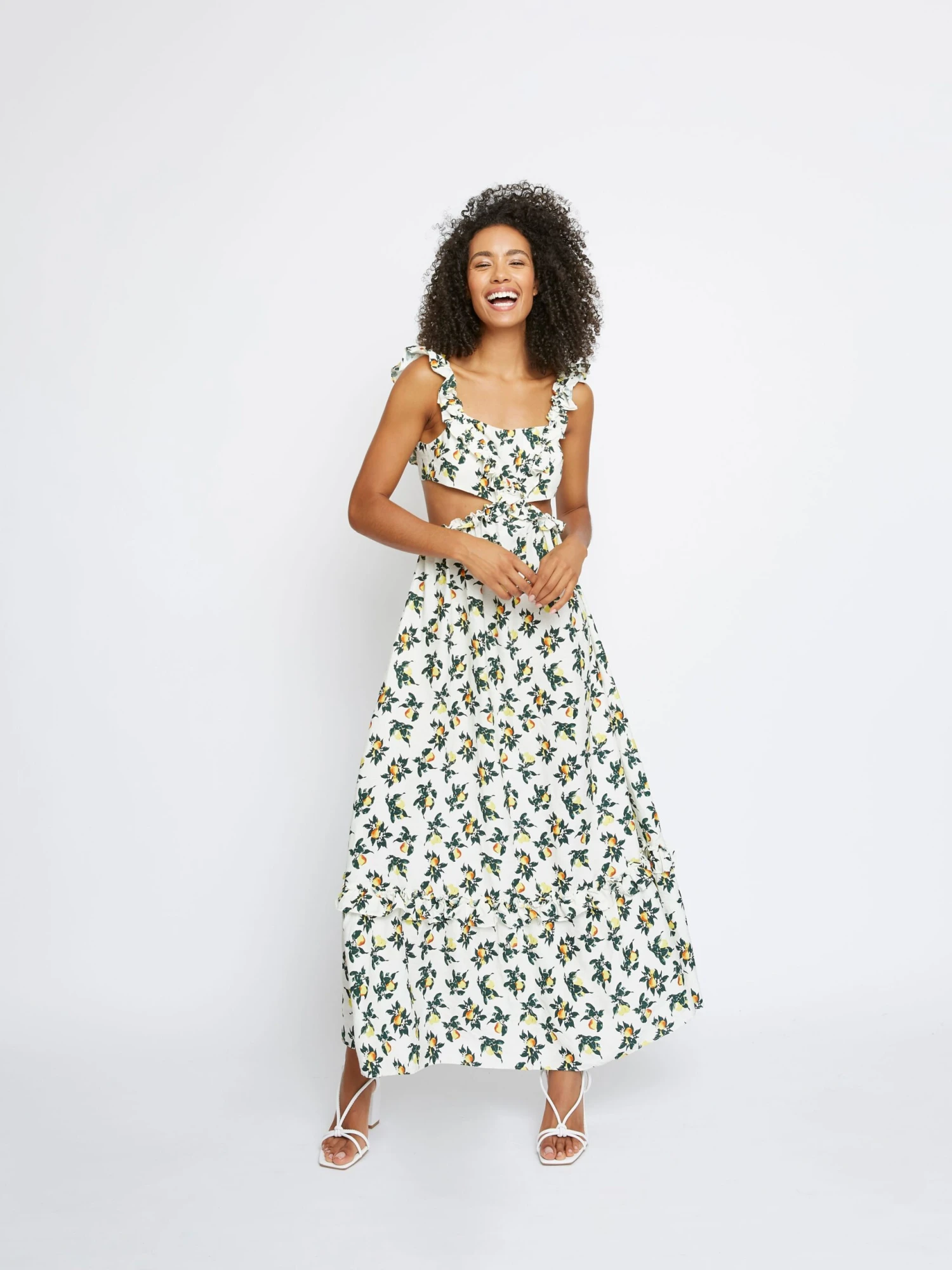 Glamorous Womens Lemon and Pear Print Maxi Dress. Featuring stunning lemon and pear print, this luxe maxi is the perfect way to refresh your wardrobe. The ultimate summer dress, this piece with cut out detail, frill trims and tie back, will be your go to for every occasion. Simply style for strappy sandals for day to night elegance.Â