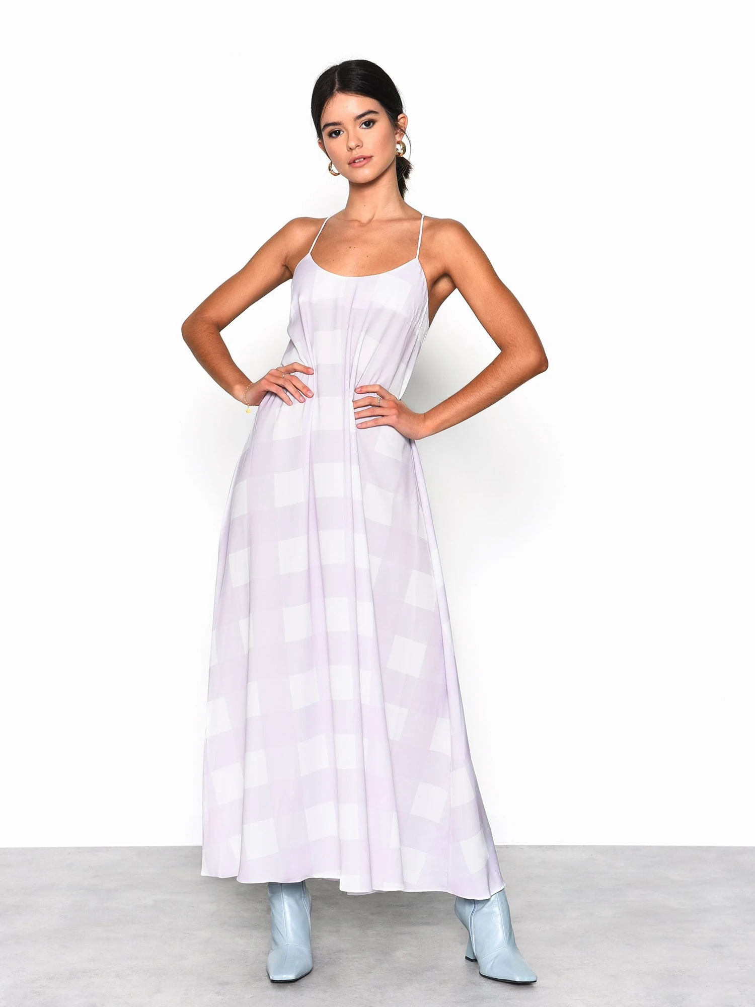 Glamorous Womens Lilac Checkerboard Print Midi Dress. This lilac checkerboard print dress in midi length is the must have staple piece this season. Featuring a check print all around and back strap detailing, this dress is super flattering addition to your closet!Â