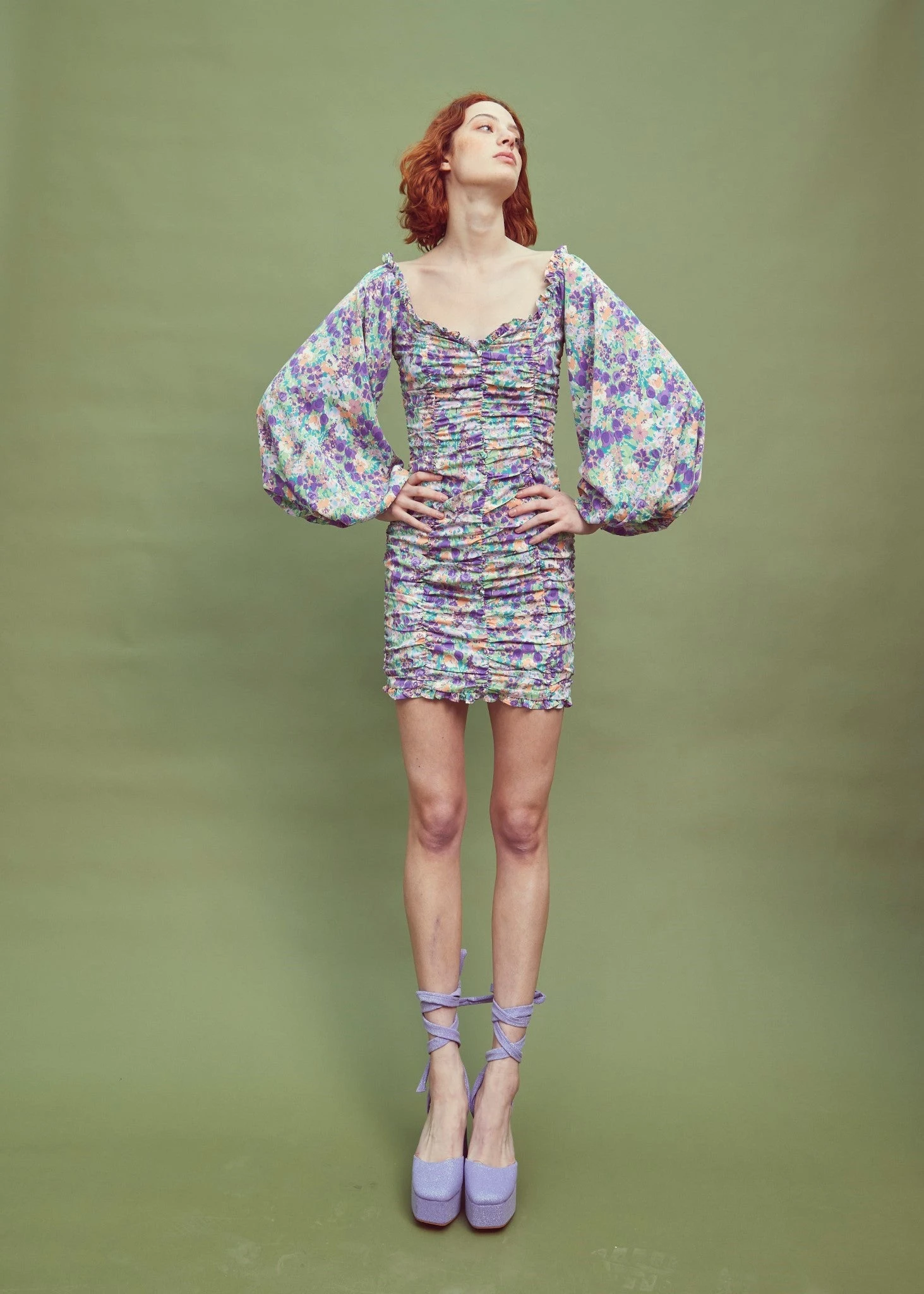 Lilac Garden Floral Long Sleeve Mini Dress. This gorgeous dress is an absolute show stopper! Perfect for all occasions, and a key piece for your wardrobe this seasons! Featuring beautiful long length puff sleeves, super flattering fit and cute ruched detail!