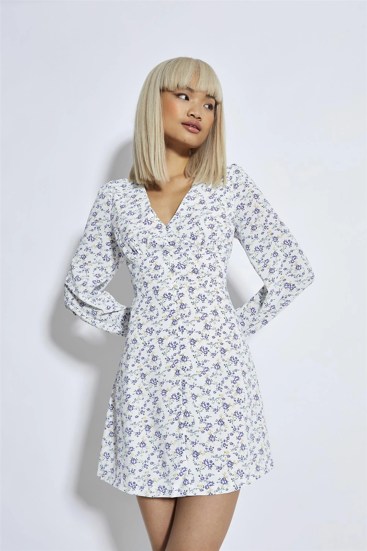 Glamorous Women’s Lilac-Yellow Ditsy V-Neck Mini-Dress. Slip into the Lilac-Yellow Ditsy V-Neck Mini-Dress and let your style shine. With its button-front closure, you can easily adjust the fit to suit your mood. The V-neck adds a touch of sophistication, while the long puff sleeves offer a playful and comfortable touch. The mini length is perfect for showing off your legs and creating a flattering silhouette. Fully lined for added comfort and coverage, this dress is ideal for a variety of occasions, from casual brunches to dressy cocktail parties. Embrace your inner fashionista and let this dress be the star of your next outfit.