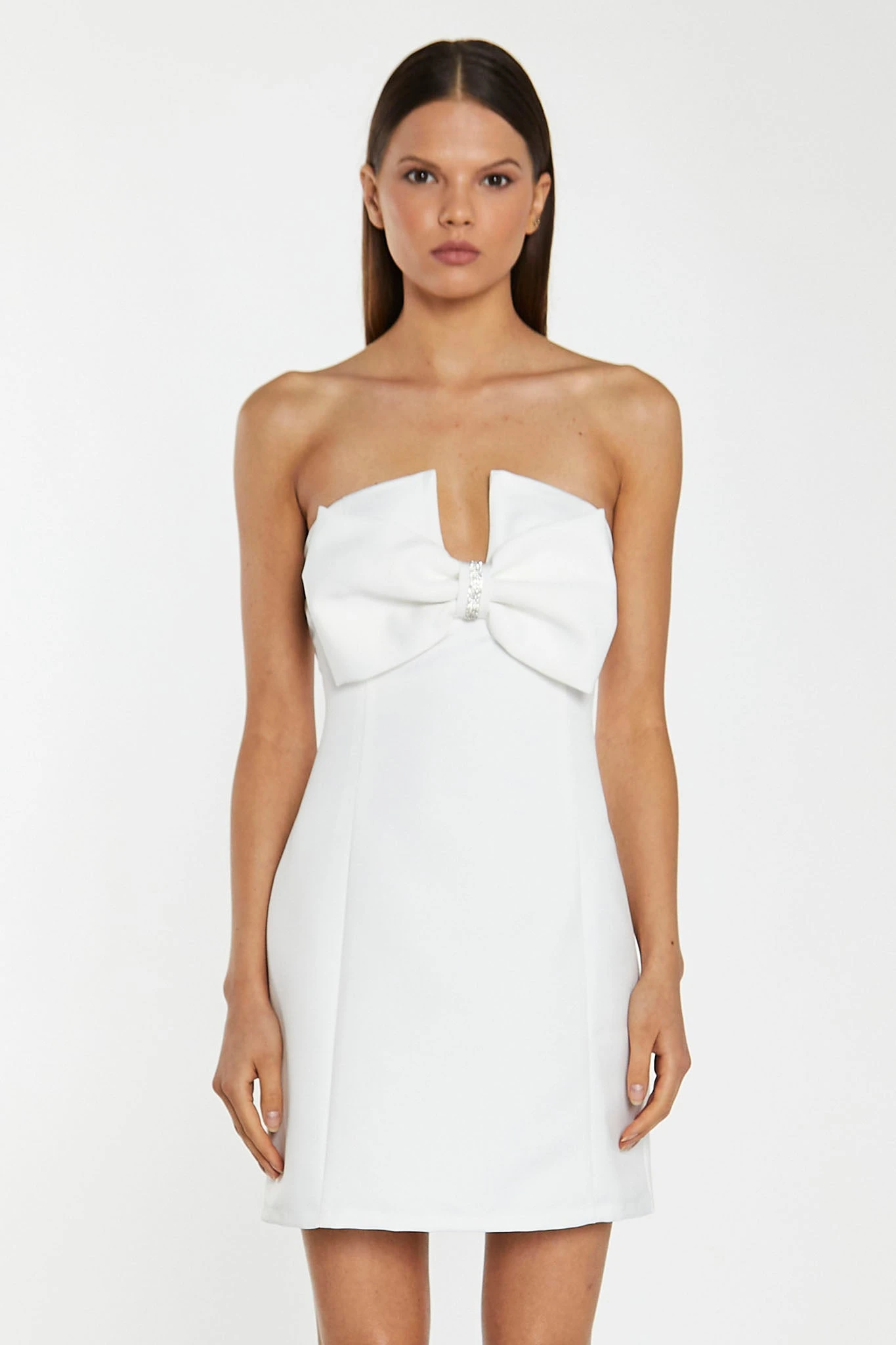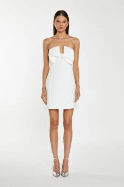 Glamorous Womens Off-White Satin Strapless Bow Mini-Dress. This Off-White Strapless Mini Dress is the ultimate showstopper! Its statement bow design, tailored fit, and mini length are sure to turn heads. Its sparkling diamante trim details finishes off the look perfectly!
