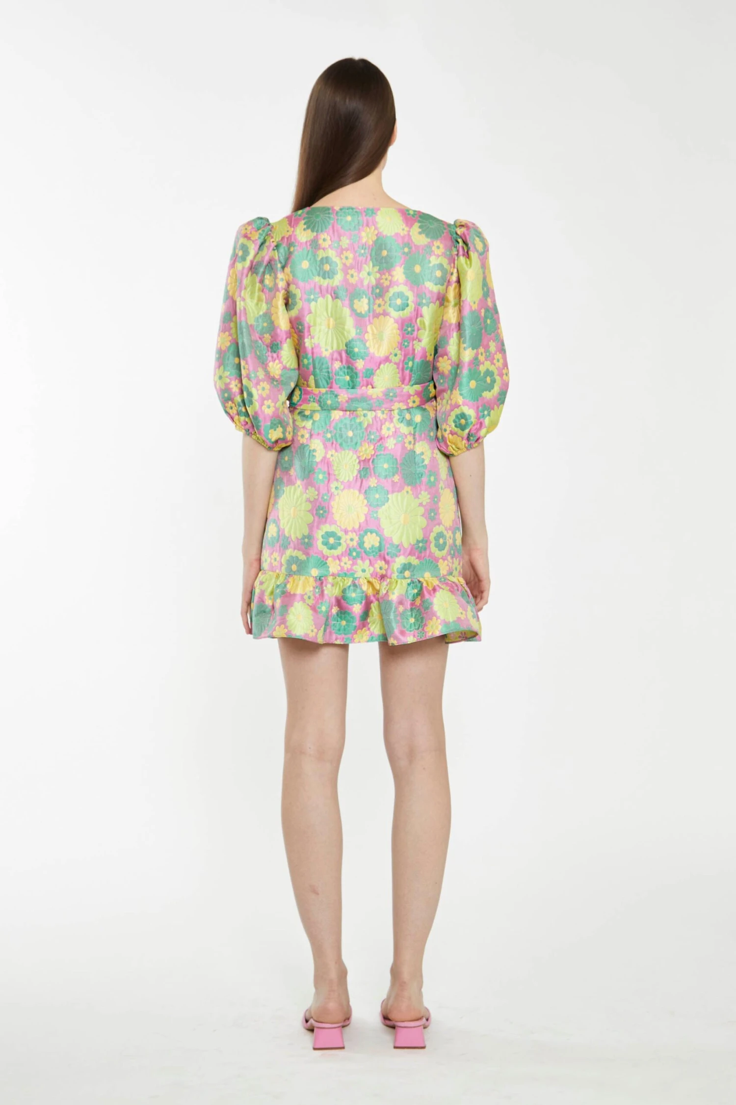 Glamorous Womens Pink-60s-Flower-Jacquard Wrap Mini Dress. This mini dress is giving us the ultimate Spring vibes this season. Featuring a retro sixties inspired flower print, puff sleeves and a V-neckline in a flattering wrap style with ruffle detail, this dress will have heads turning. Elevate the look with some mule sandals and a cute strappy bag for an on-trend vibe.