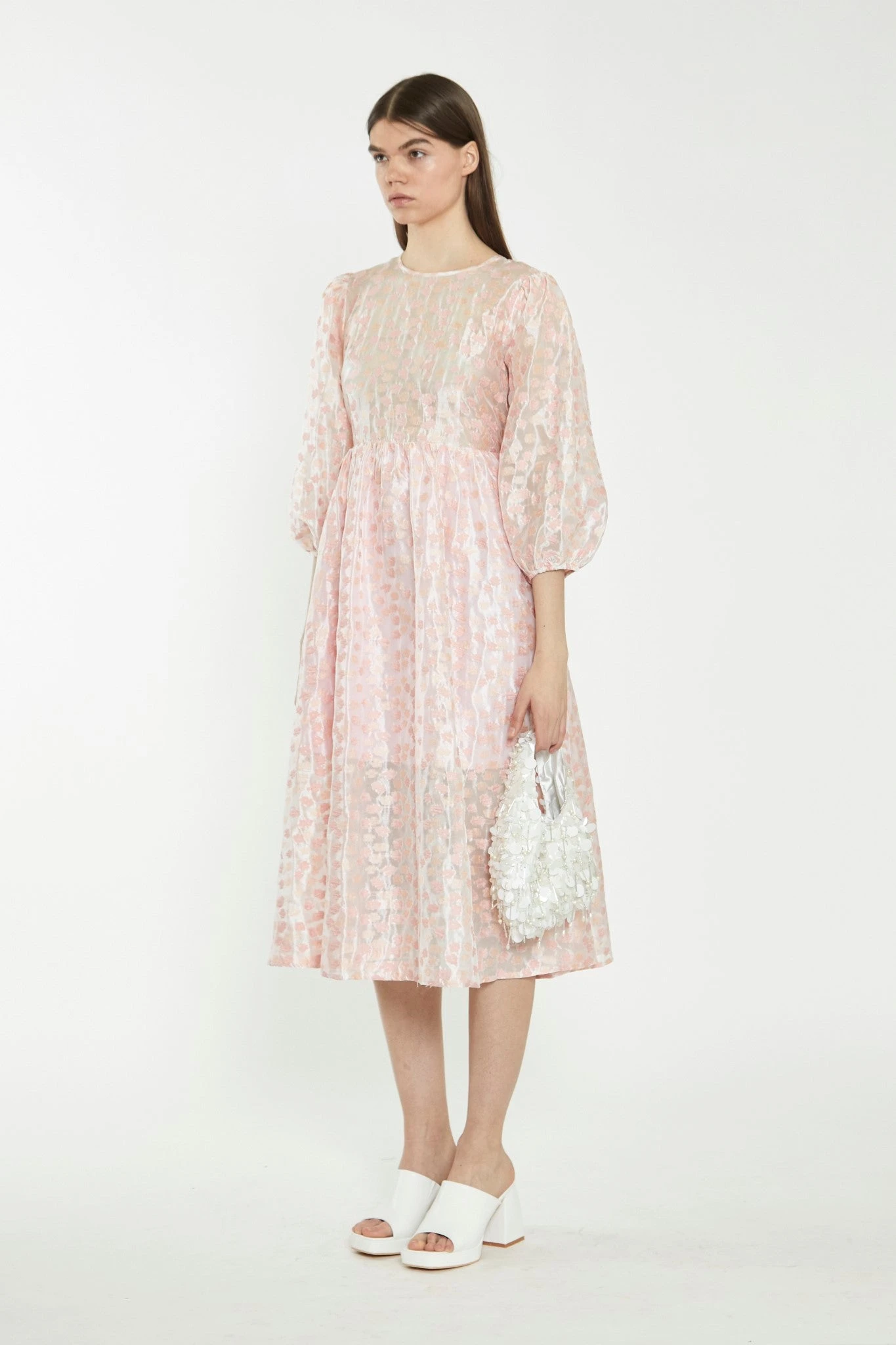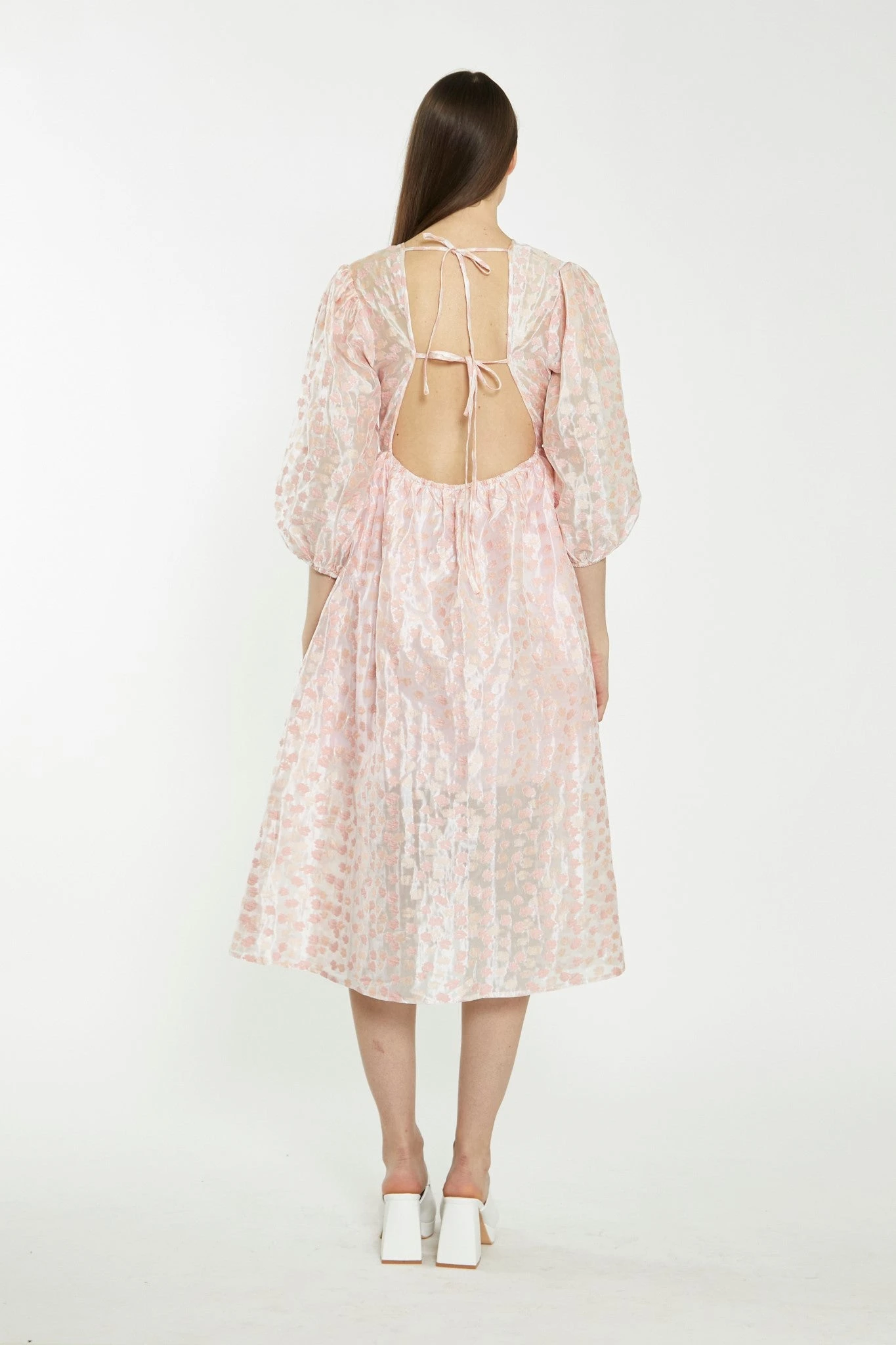 Glamorous Womens Pink Flower Organza Midi Dress. This gorgeous midi dress is an absolute show stopper! Featuring puff sleeves and an open back with tie back detail, you wont regret adding this piece to your wardrobe. Elevate the look with some mule sandals and a mini handbag for an on-trend vibe.