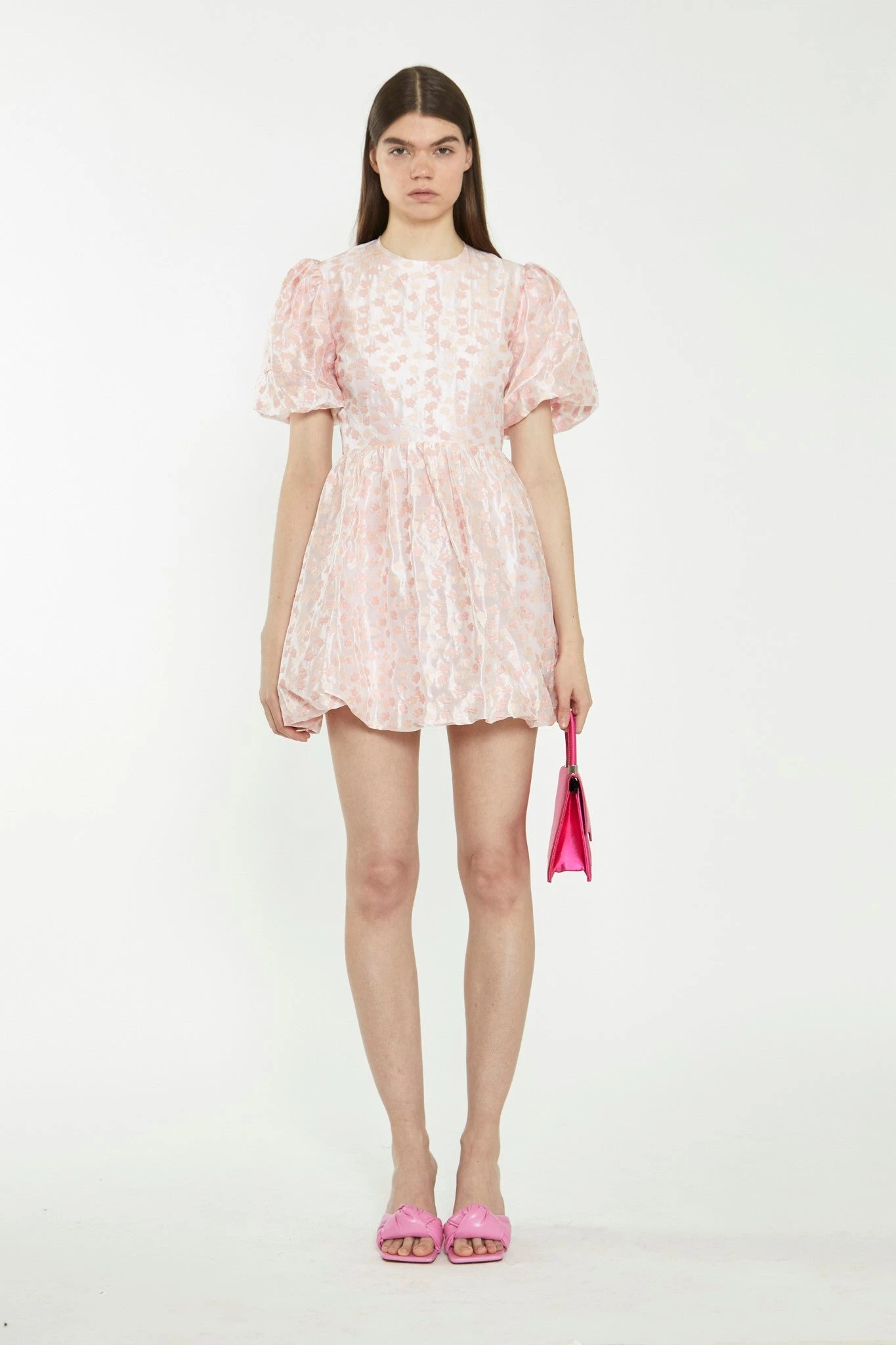 Glamorous Womens Pink Flower Organza Mini Dress. We cant get enough of this gorgeous organza mini dress! Featuring puff sleeves and an open back with tie detail, this dress is perfect for you. Take the outfit from day to night with some mule sandals and a statement mini handbag.
