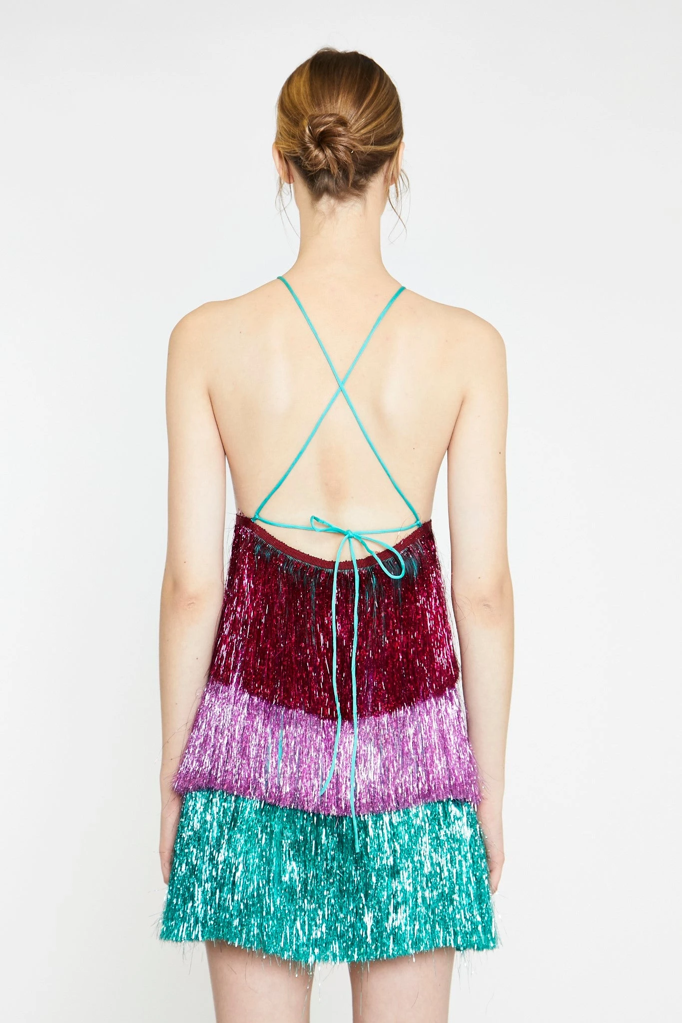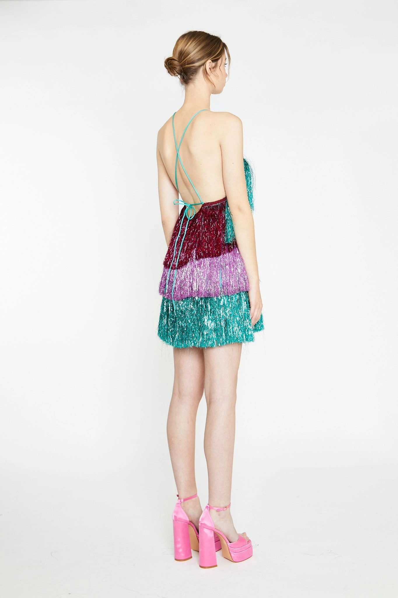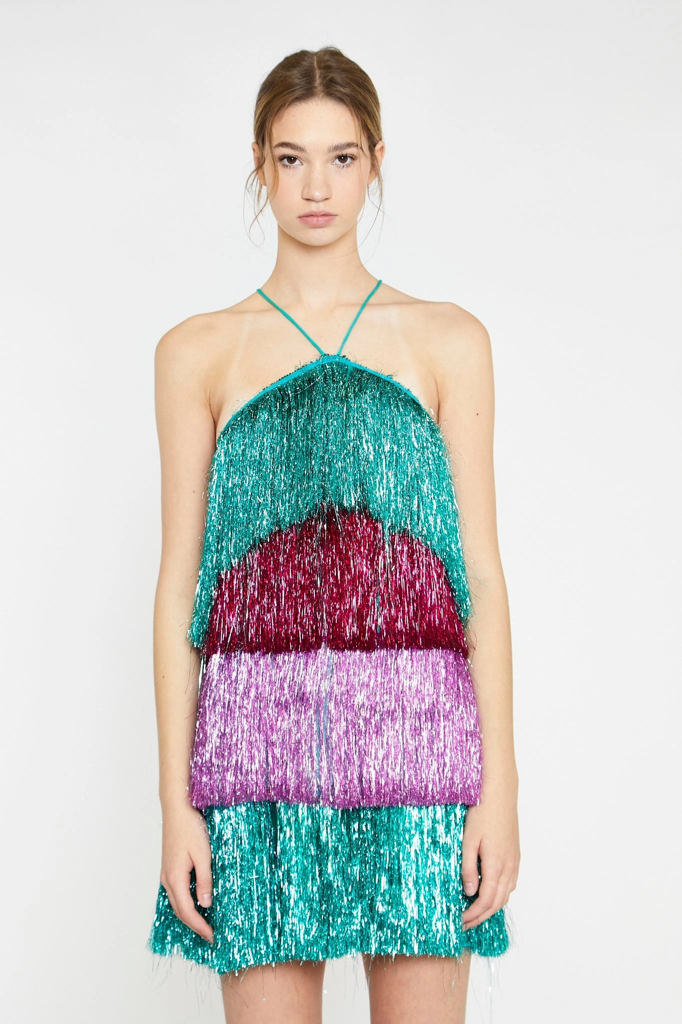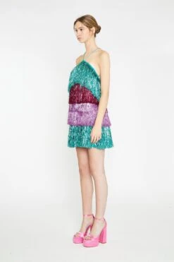 Glamorous Womens Pink Teal Purple Tinsel Fringe Halterneck Mini-Dress. Make the whole place shimmer in this stunning dress! Featuring tiered layers of colour blocked tinsel fringe fabric, a halterneck design and cross over back straps, this mini dress is a unique must have piece! Style with a pair of our platform heels for the ultimate part look!