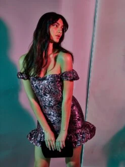 Glamorous Womens Purple Metallic Brocade Sweetheart Neck Puff Shoulder Ruffle Hem Mini Dress. This show stopping dress is one of our favourite date night looks here at Glamorous. Sexy yet sophisticated with puff shoulders, sweetheart neckline and a ruffle hem finish, this dress will definitely have heads turning. Pair with white lace up heels for the perfect Autumn/Winter chic party look.