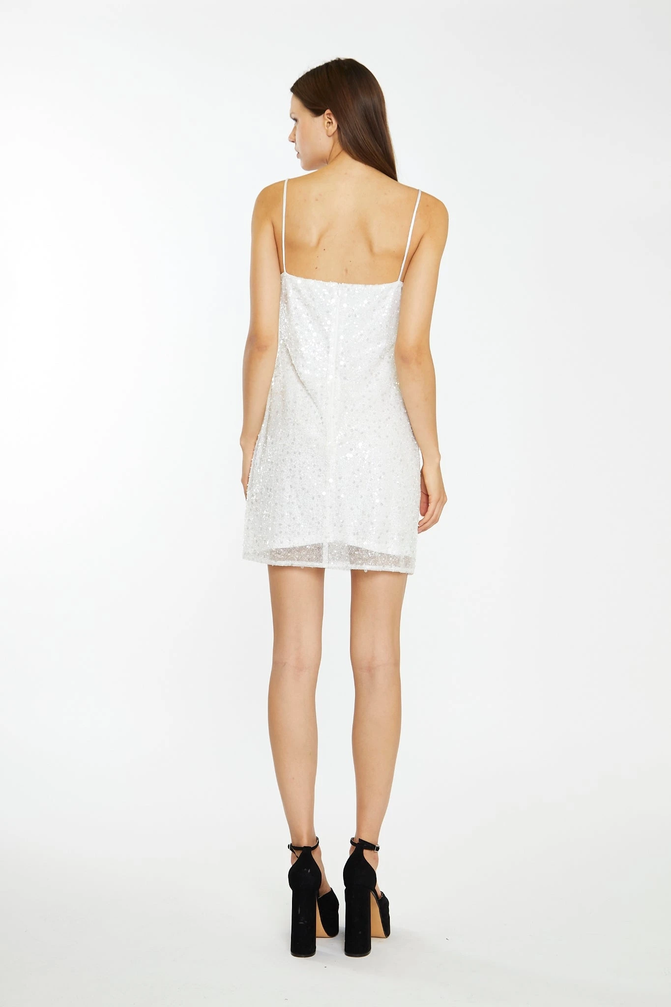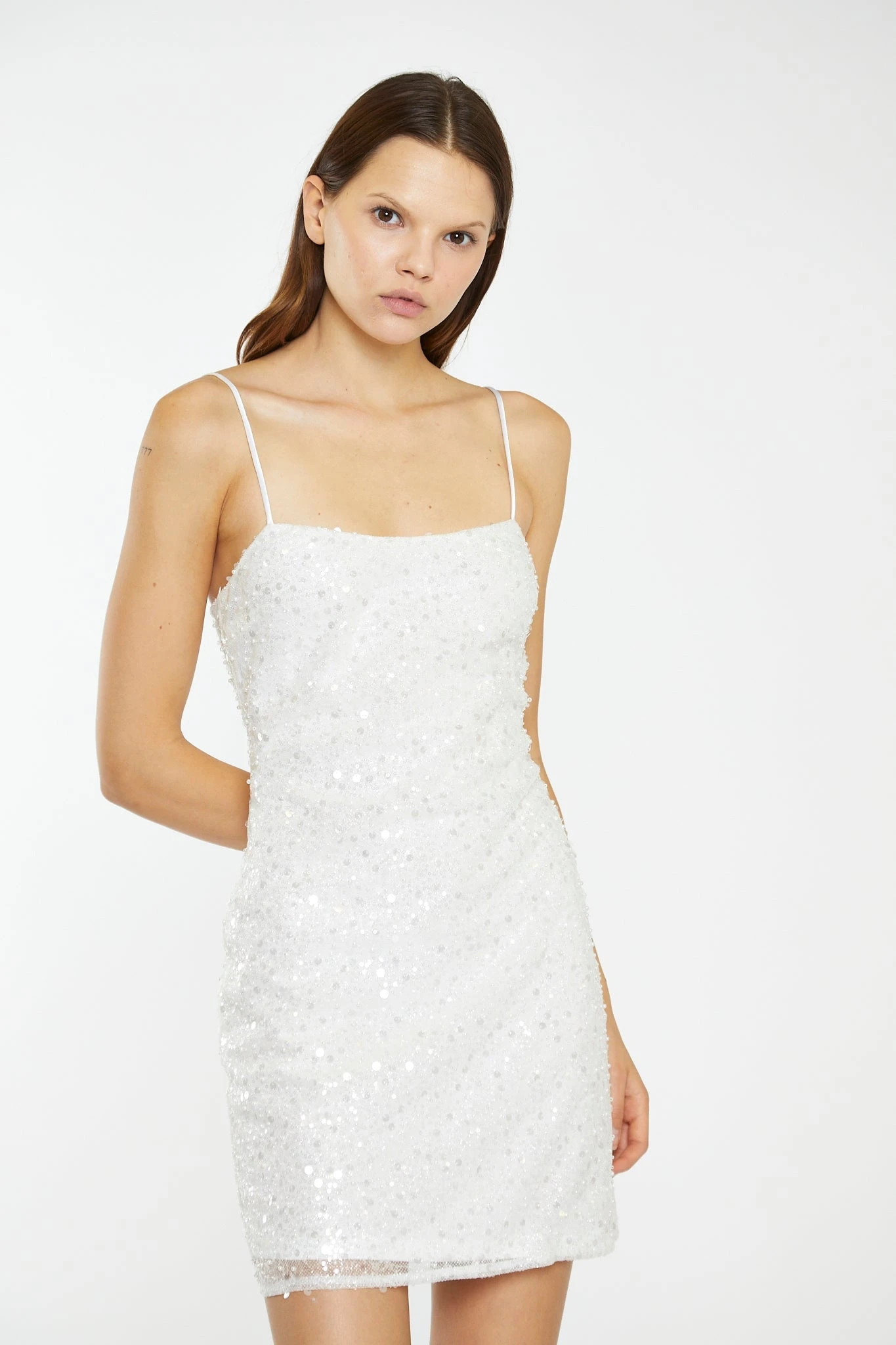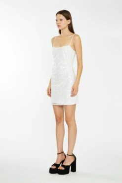 Glamorous Womens Silver Pearl-Sequin Strappy Bodycon Mini-Dress. Look stunning in this Silver Strappy Mini Dress. Made of luxe pearl sequin fabric, this dress has a flattering bodycon fit and chic strappy design. This dress is perfect for any truly special occasion!