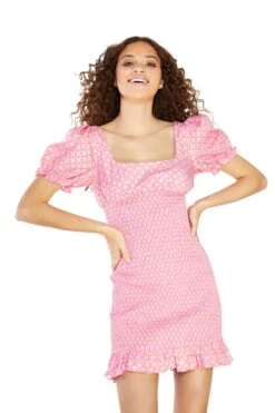 Glamorous Womens Sixties Geo Ditsy Puff Shoulder Frill Hem Mini Dress. Opt for a sixties style with this flattering mini dress. This super flattering dress features puff shoulders, frill hem and short sleeves. Style with strappy sandals for the daytimes and heels for the evening!