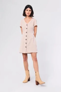 Glamorous Womens Stone Button Front short Sleeve Mini Dress. This mini dress is the perfect piece to add to your autumn wardrobe. Featuring a button front, short sleeves and a flattering fit this will look great on you! Style with heeled boots for a fashionable casual look.