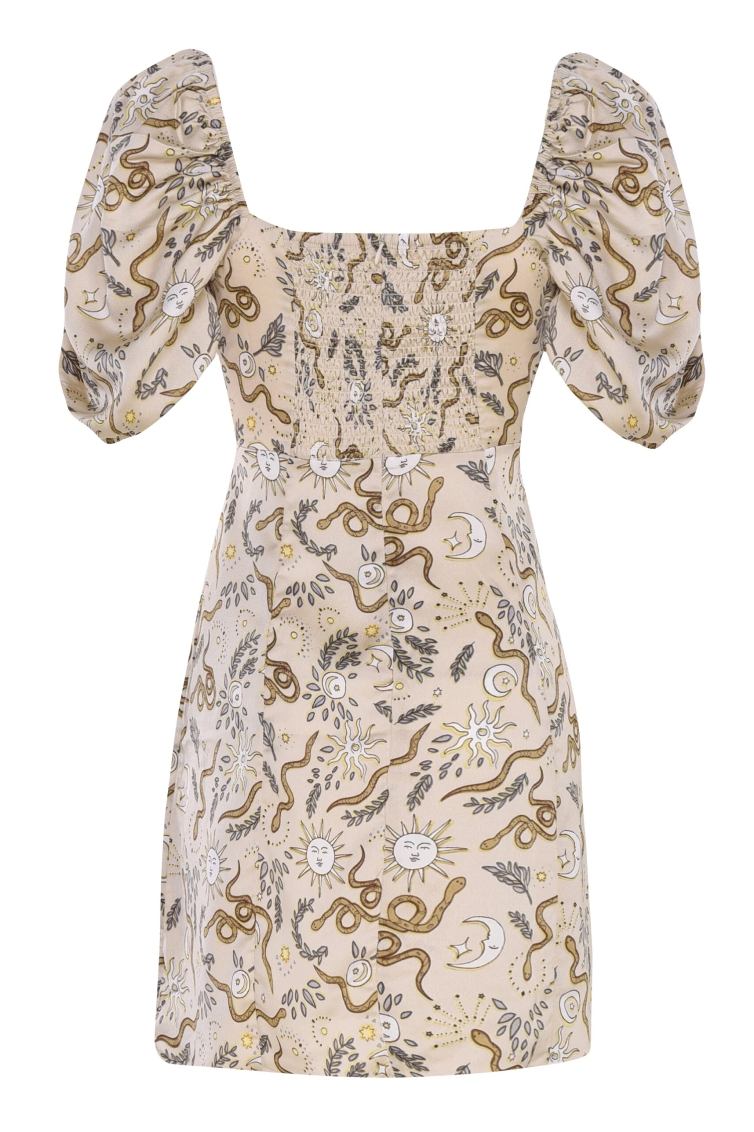 Glamorous Womens Stone Sun Moon Pattern Square Neck Mini Dress. Opt for an on trend piece with this on trend mini dress. This super flattering dress features square neck and a fashion forward pattern, we love this dress! Style with chunky boots for the daytimes and heels for the evening! We love this piece here at Glamorous!
