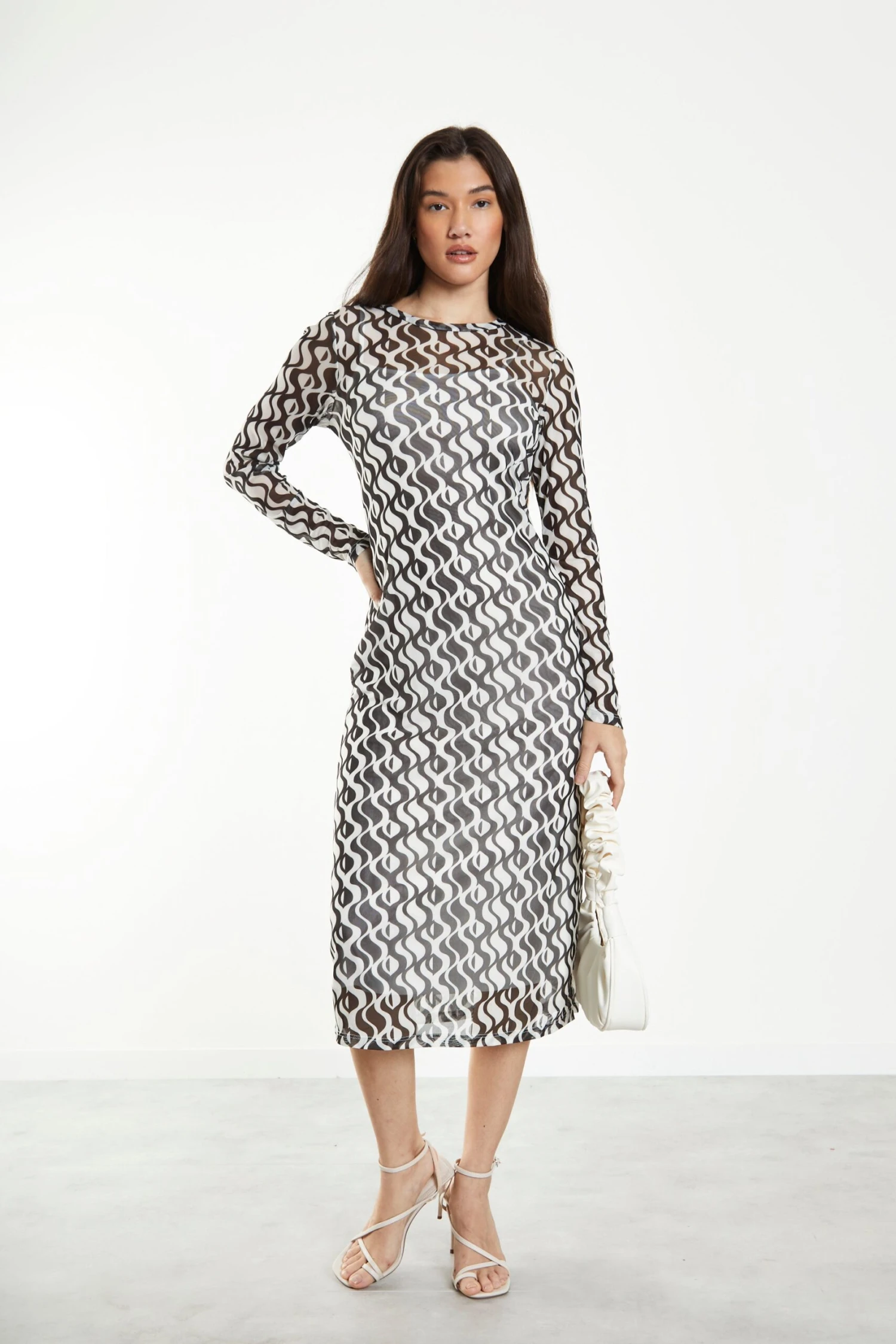 Glamorous Wavy Mono Mesh Midi dress with Long Sleeves & Cami Slip. This staple midi dress is perfect for your autumn wardrobe. Featuring long sleeves and removable cami slip dress, all in a fun monochrome print, this dress will be your best-friend this season. Dress this gorgeous piece up or down with trainers or heels, its a must have for your season wardrobe.