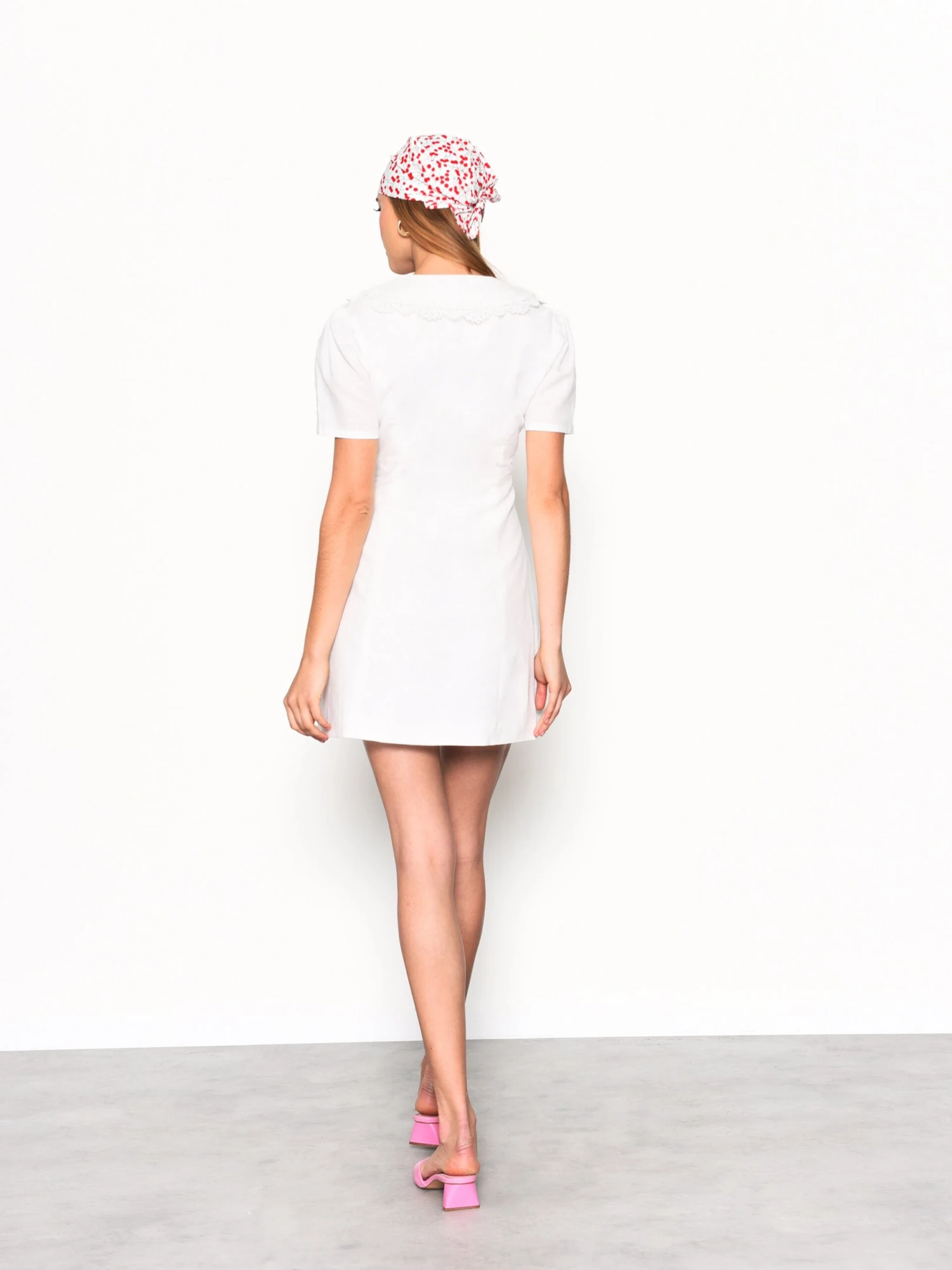 Glamorous Womens White Button up Collar Detail Mini Dress. This statement piece will look great this season. Featuring a button up front and lace collar detail, this flattering dress will not fail to turn heads! Elevate the look with some mule sandals and a cute strappy bag for a on trend vibe.Â