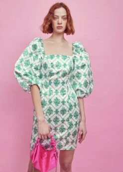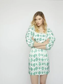 White Green Damask Puff Sleeve Mini Dress. This statement dress is bound to look fabulous on you this valentines day. Puff Sleeve Detail and an intricate design, this piece will stand out from the crowd. Pair with lace up heels and a white clutch for a knock out look this season.