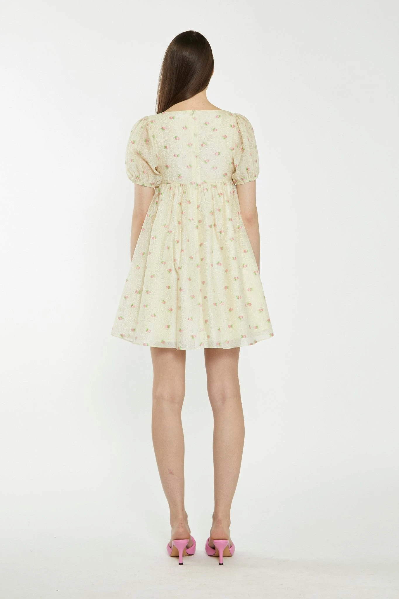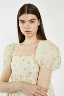 Glamorous Womens Yellow-Pink-Fruit-Organza Babydoll Mini Dress. Opt for a refreshing fruit print with this flattering mini dress. Featuring a square neckline and puff sleeves in an on-trend babydoll style, this dress is the perfect way to elevate your look for Spring. Pair with some heeled mules for an effortlessly chic look.