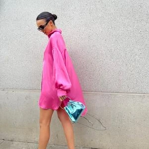 Glamorous Women’s Pink Sateen Oversized Mini Shirt-Dress. This classic shirt dress in a refreshing pink sateen fabric is destined for your wardrobe this season. Featuring button front detail with long sleeves and a flattering oversized relaxed fit, this mini dress will look great on you! Pair with some chunky loafers for the perfect daytime outing this season.